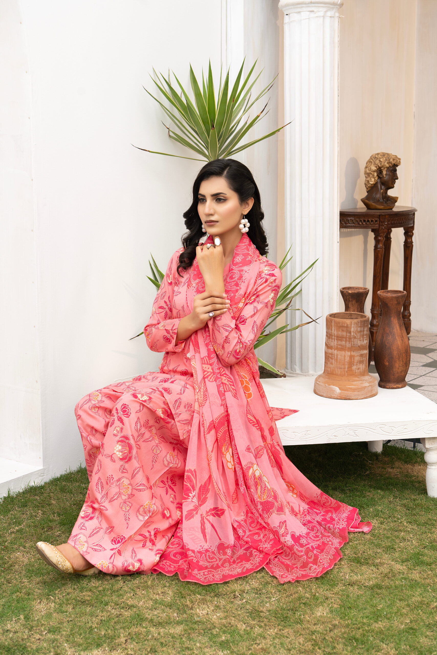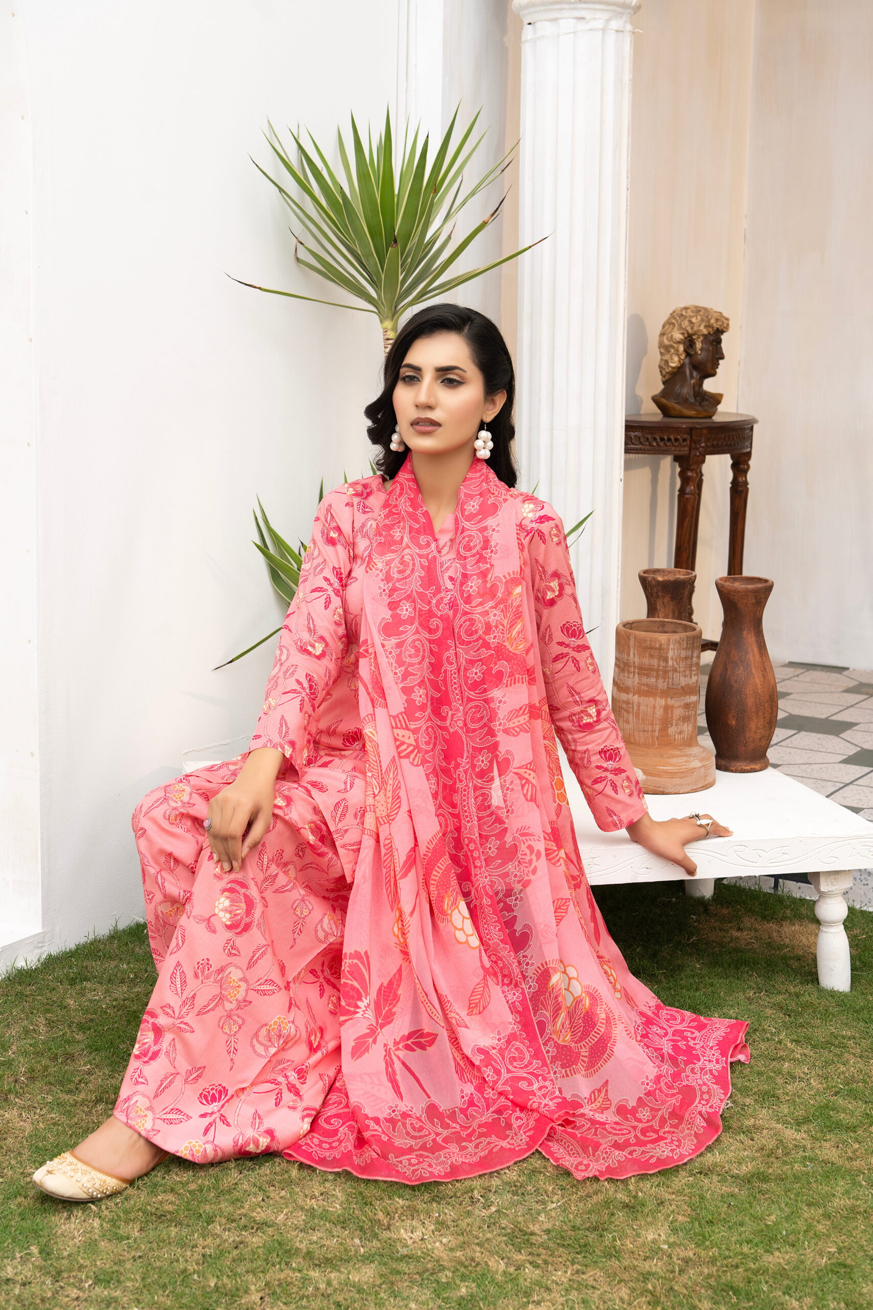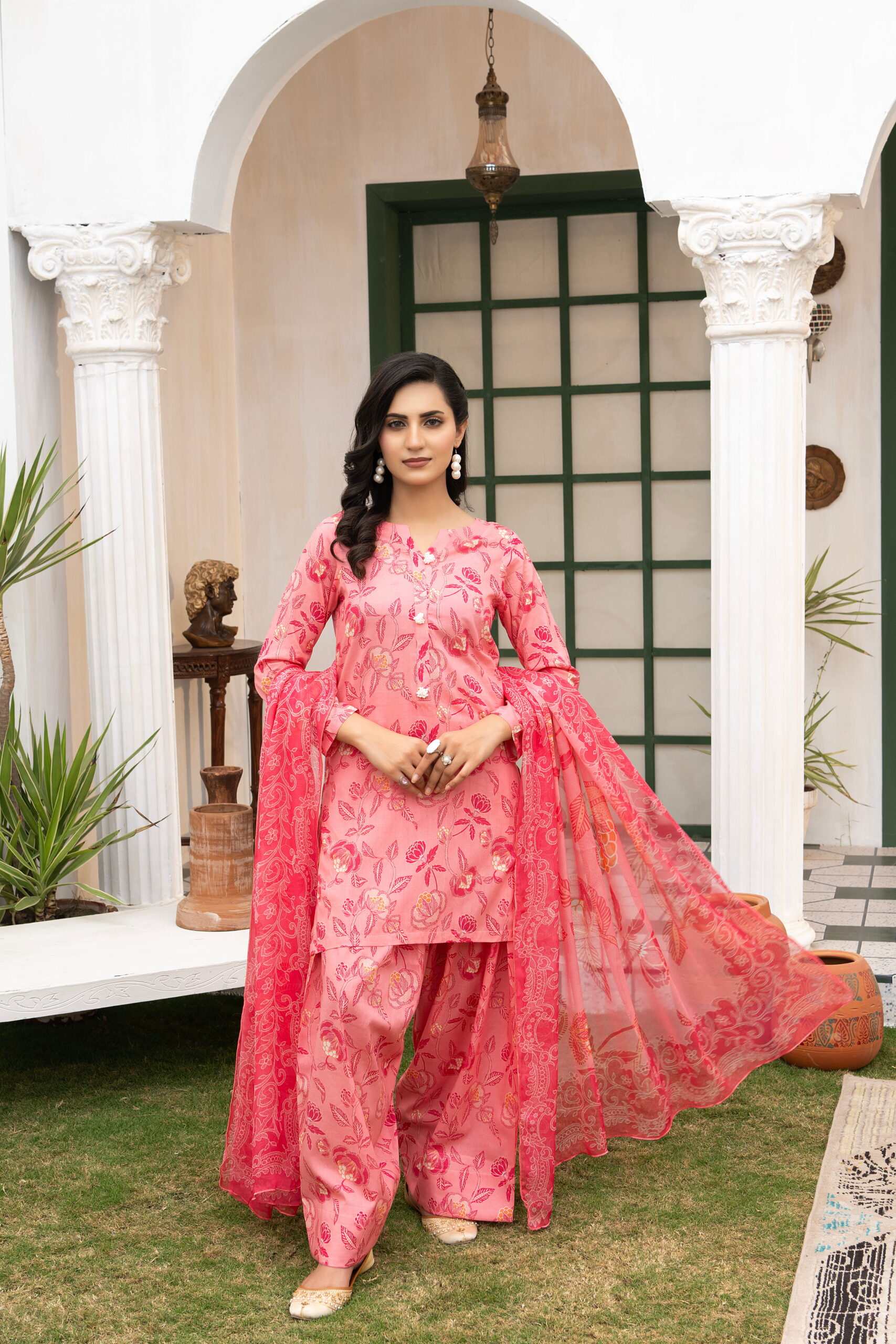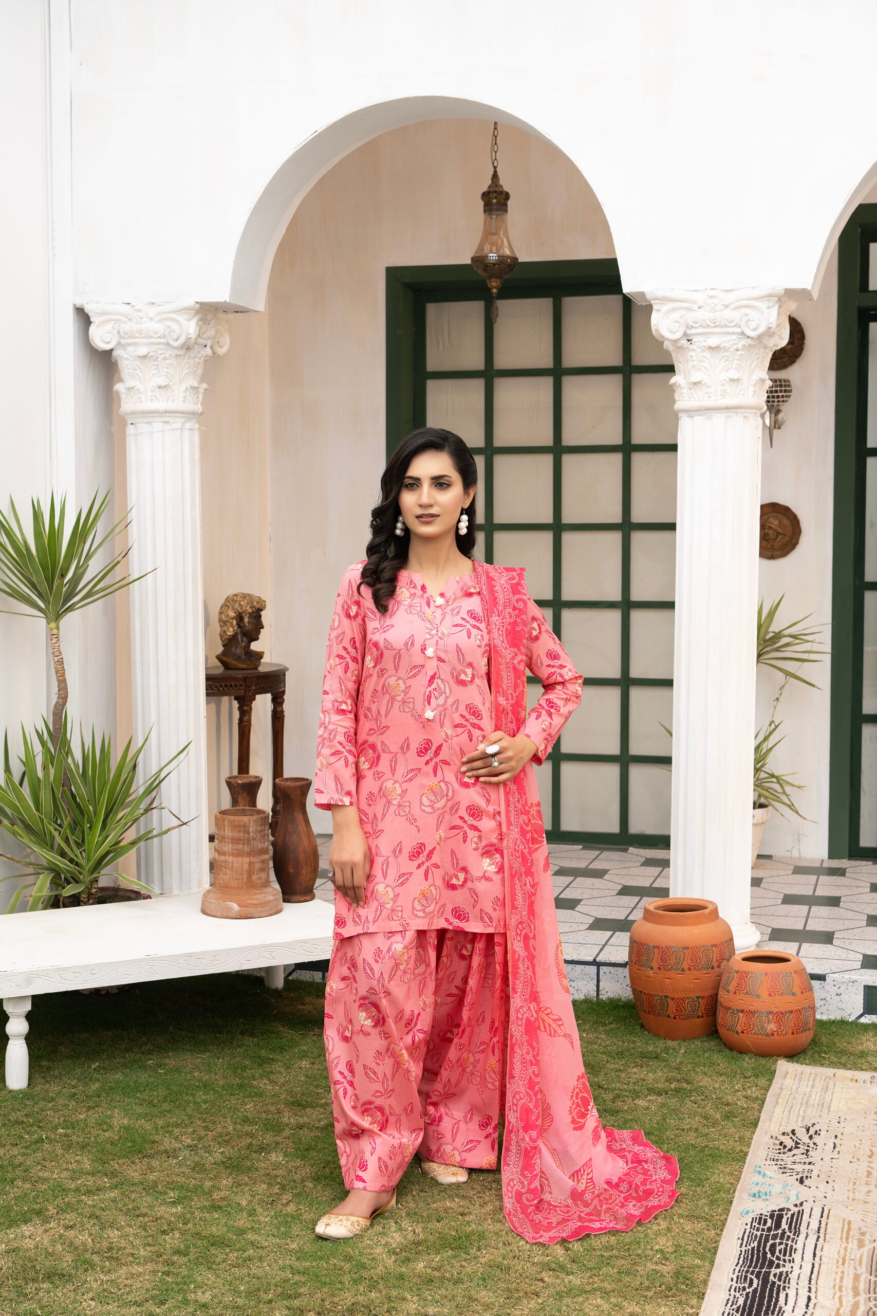 The Bunaaz Summer Collection presents Daastan, a vibrant three-piece ensemble that celebrates feminine charm and timeless floral elegance. The outfit features a soft blush pink lawn shirt adorned with delicate rose and botanical prints in deeper coral and crimson tones, paired with coordinated printed trousers and a flowing crinkle dupatta that enhances the outfit with graceful movement. The rich floral detailing combined with the soft pastel base creates a refreshing and sophisticated summer look.